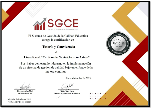 Compromiso con la ExcelenciaEl Liceo Naval “C. de N. Germán Astete” continúa implementando políticas alineadas con el Sistema de Gestión de la Calidad Educativa (SGCE). Este reconocimiento evidencia su compromiso sostenido con la mejora continua y la excelencia en la formación integral de sus estudiantes.