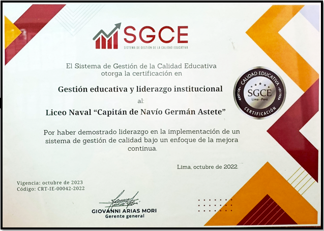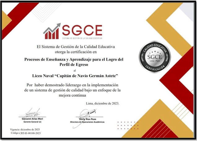 Compromiso con la ExcelenciaEl Liceo Naval “C. de N. Germán Astete” continúa implementando políticas alineadas con el Sistema de Gestión de la Calidad Educativa (SGCE). Este reconocimiento evidencia su compromiso sostenido con la mejora continua y la excelencia en la formación integral de sus estudiantes.